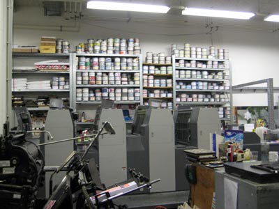 This is the press. The paper runs through the 5 grey thingies (the first of which is almost hidden on the very left hand side) from left to right. In each of them a print roll applies tiny dots of a different colour on the paper: magenta, cyan, yellow or black. The last one applies the printing varnish.